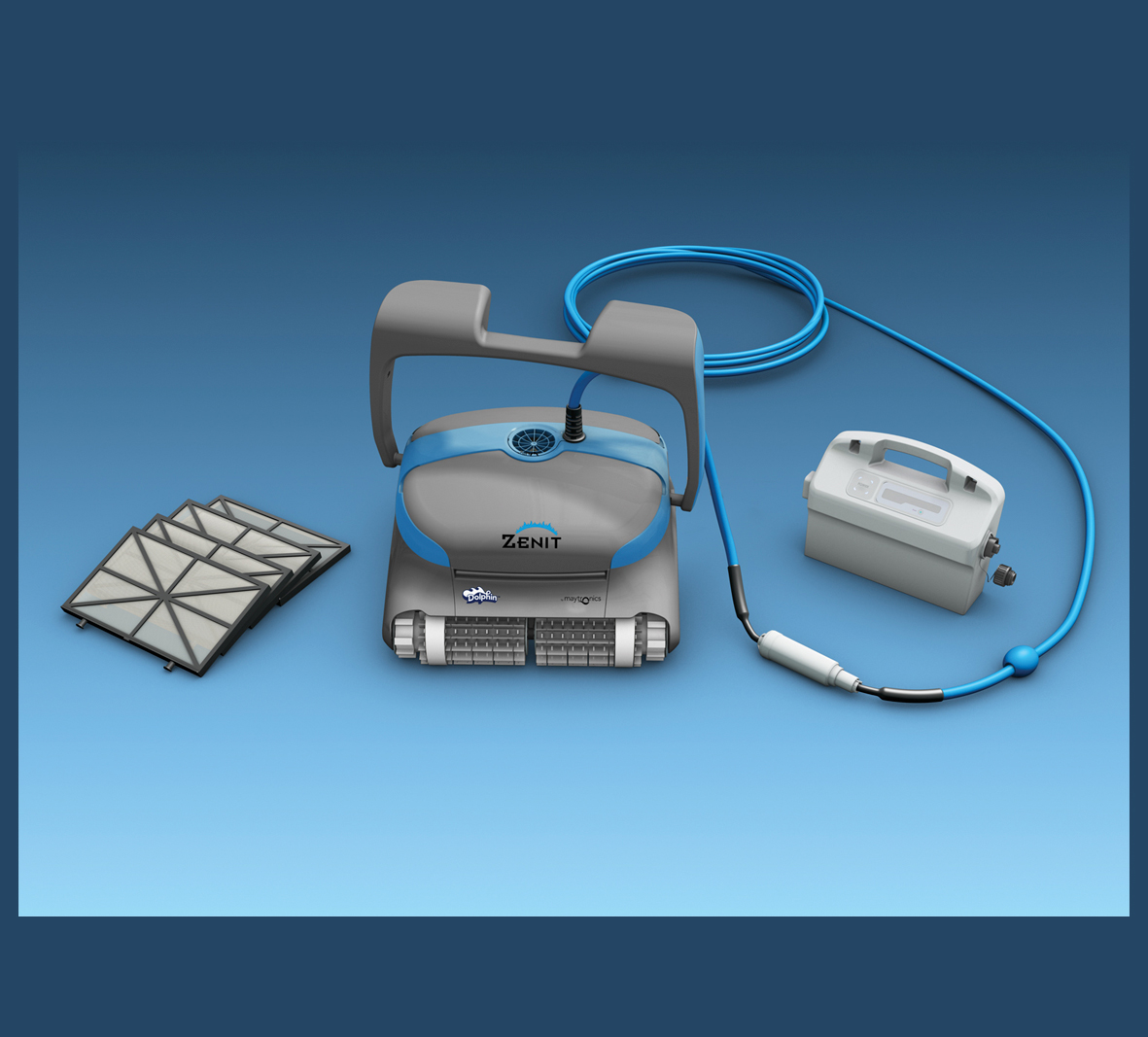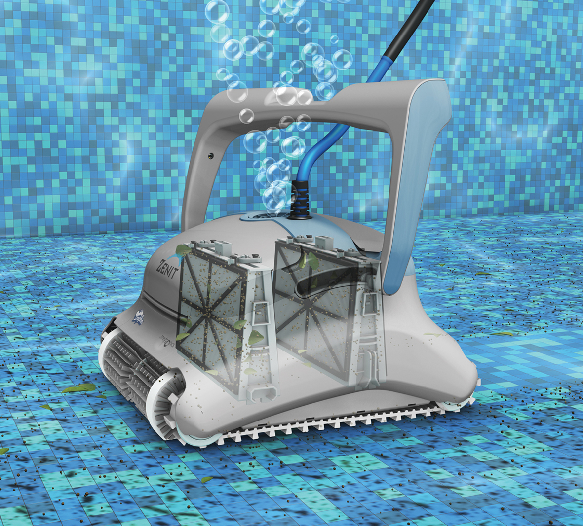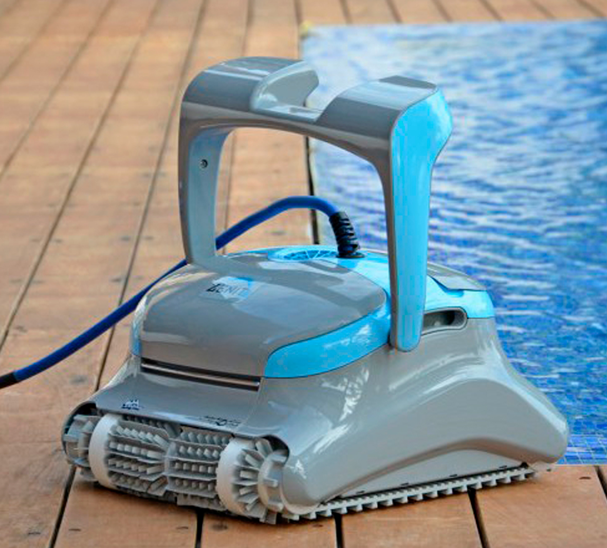 Limpiafondos automático Dolphin Zenit 20 de Maytronics. El robot para piscina llega hasta la linea de flotación realizando la limpieza del fondo, media caña y paredes. Incluye carro de transporte. Navegación manual mediante App descargable.