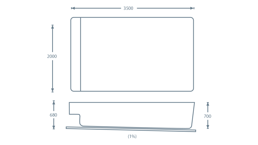 La mini piscina modelo MINI 350 dispone de unas medidas de 3,50m de Largo y 2,00m de Ancho. Su profundidad mínima es de 0,67 hasta 0,70 de profundidad máxima, con un 1% de pendiente. Dispone de 7m2 de lámina de agua y un cubicaje de 5.000L aprox.