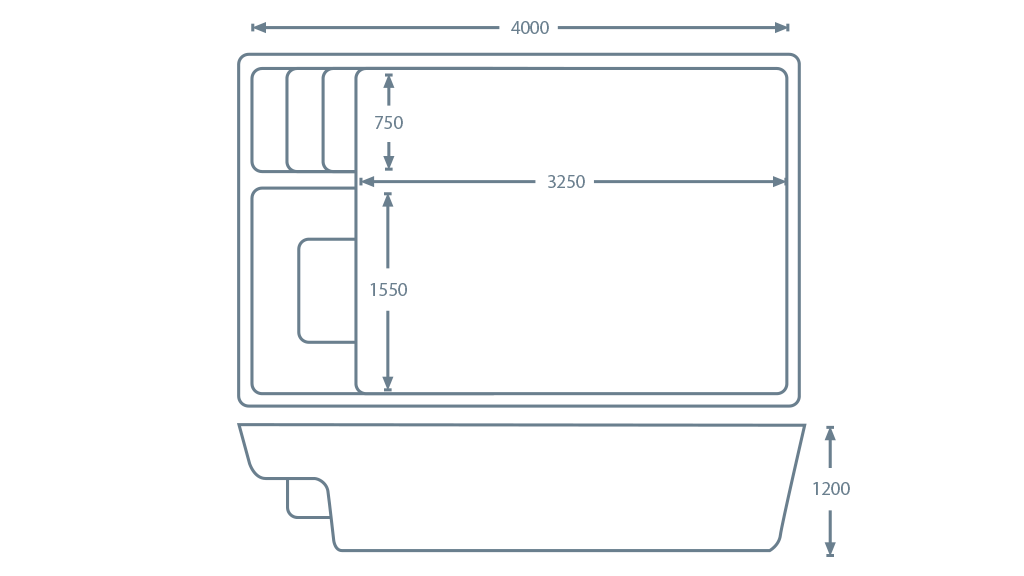 La mini piscina modelo REC-400 PLUS, con medidas de 4,00m de largo y 2,40m de ancho, la profundidad es de 1,20m sin desnivel. Con los 10m2 de lámina de agua y un cubicaje de 11.000L, este nuevo modelo amplia aún más el abanico de mini piscinas tan demandado en la actualidad.